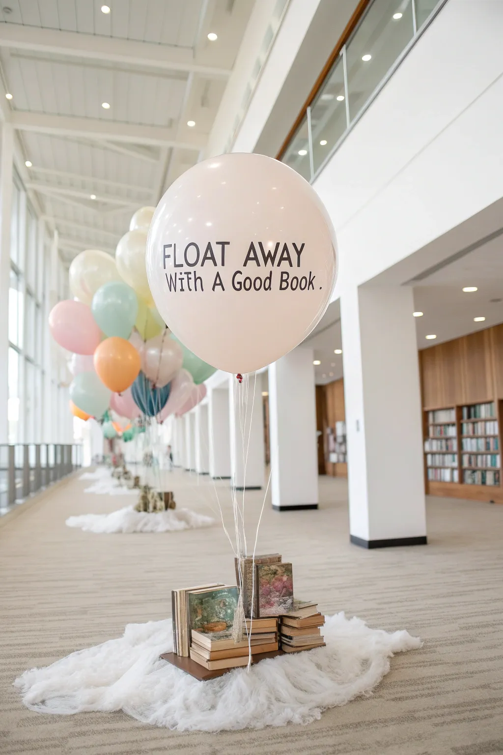Create a whimsical display using balloons and clouds to invite readers to ‘Float Away with a Good Book.’ I love how the lightness of balloons adds a sense of adventure.
