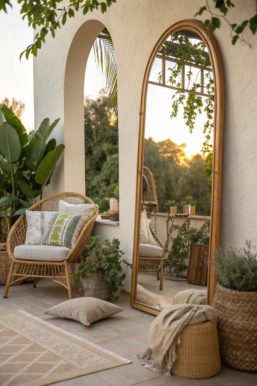 Use an arch mirror on your patio to reflect outdoor greenery and create a serene space. It blends indoor and outdoor vibes effortlessly.