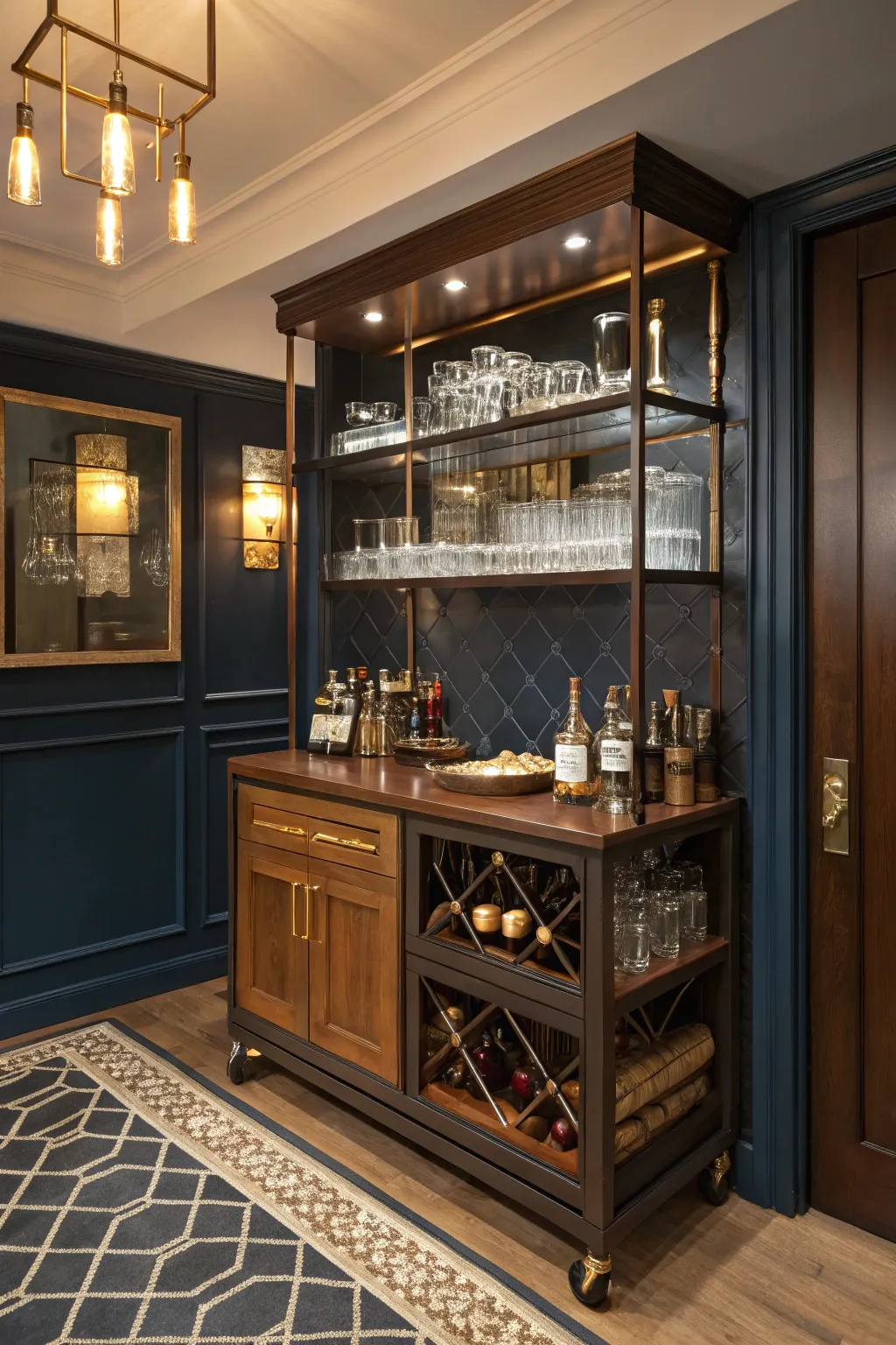 Consider a portable bar cart that can be tucked away in a closet when not in use. This flexible option is perfect for those who love to entertain on the go.