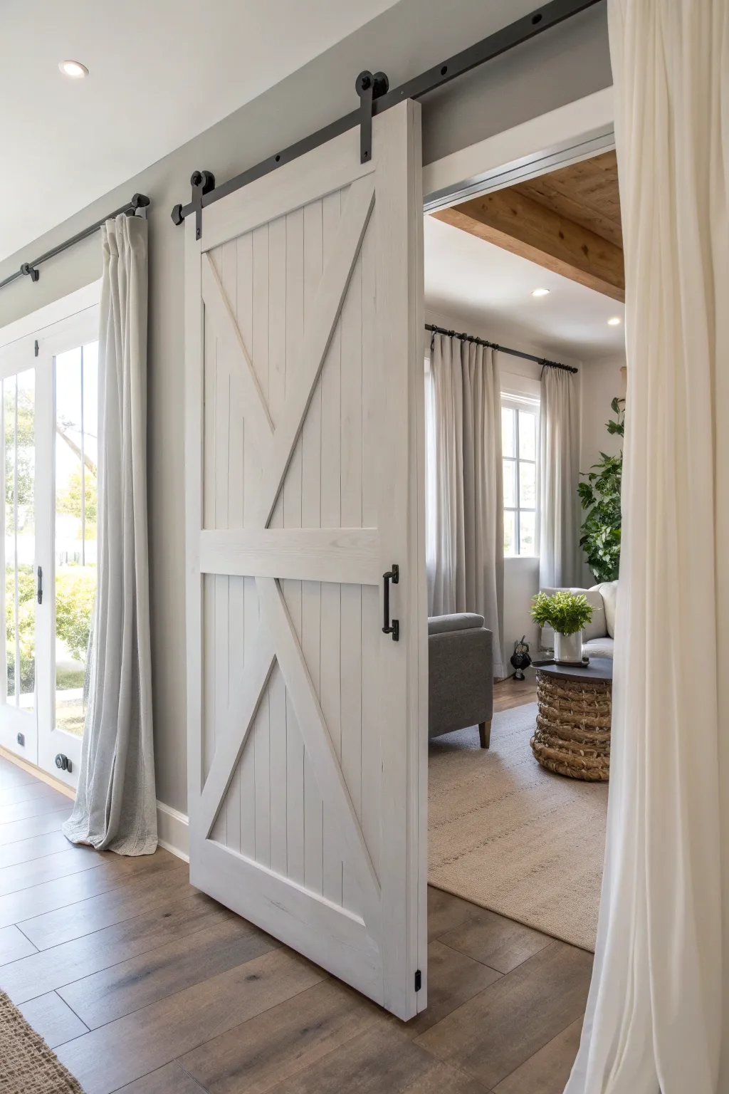 A white barn door introduces a touch of classic elegance and creates a bright, airy feel. I’ve used this in smaller spaces to make them feel larger and more open.