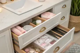 Consider open shelving to display your bathroom essentials in a chic, organized manner. It’s practical, stylish, and adds an airy feel to the space.