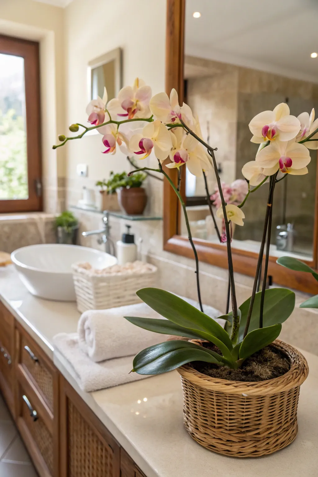 Orchids add an elegant touch to any bathroom, thriving in the warm, humid conditions. Their delicate blooms bring both color and sophistication.