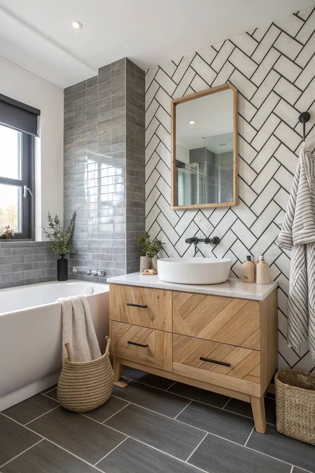 Experiment with tile work like herringbone for a unique visual impact. It’s one of my favorite ways to add character and depth.