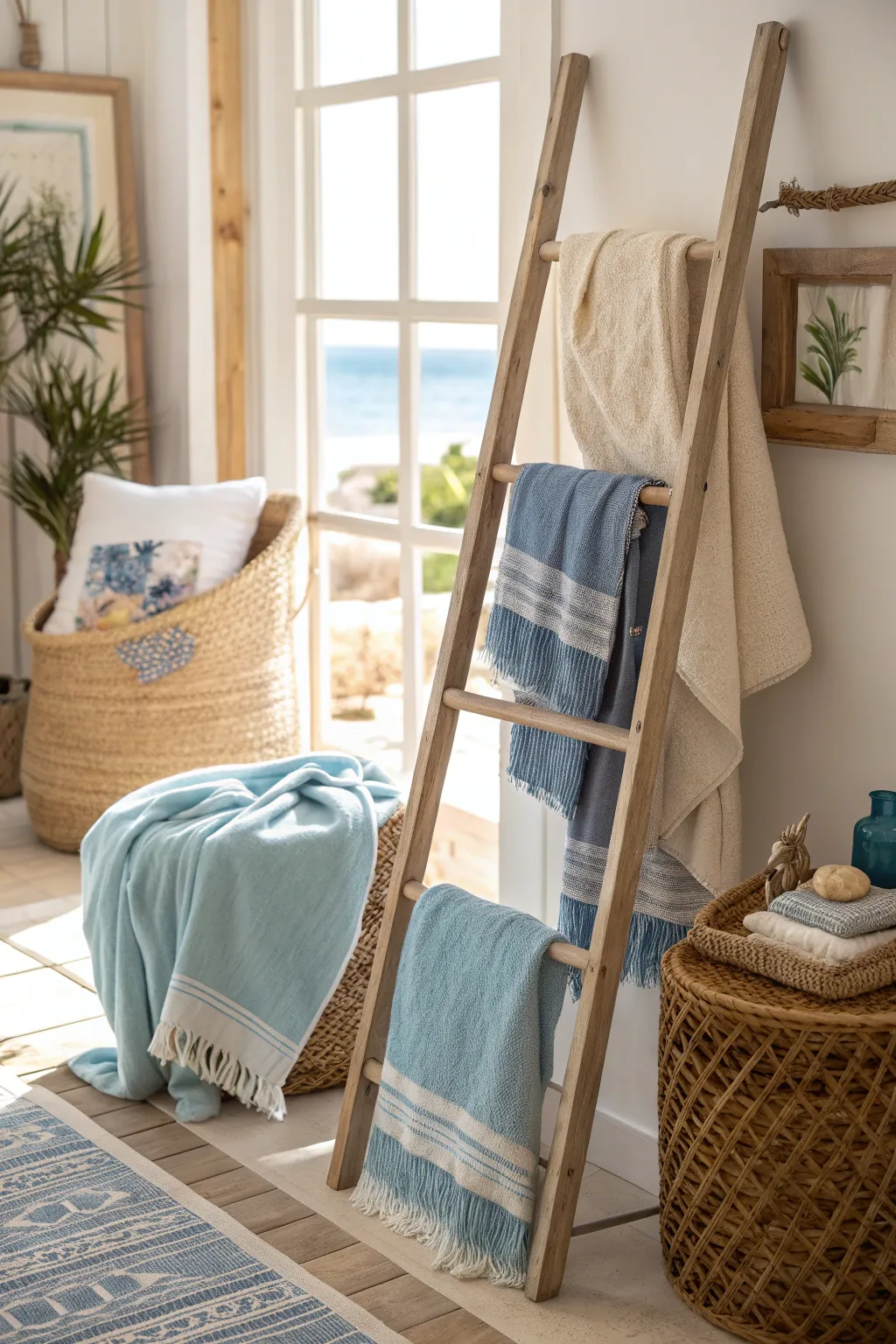 Use a decorative ladder to drape towels, adding a rustic touch to your decor. I love how it doubles as a design feature in my living space.