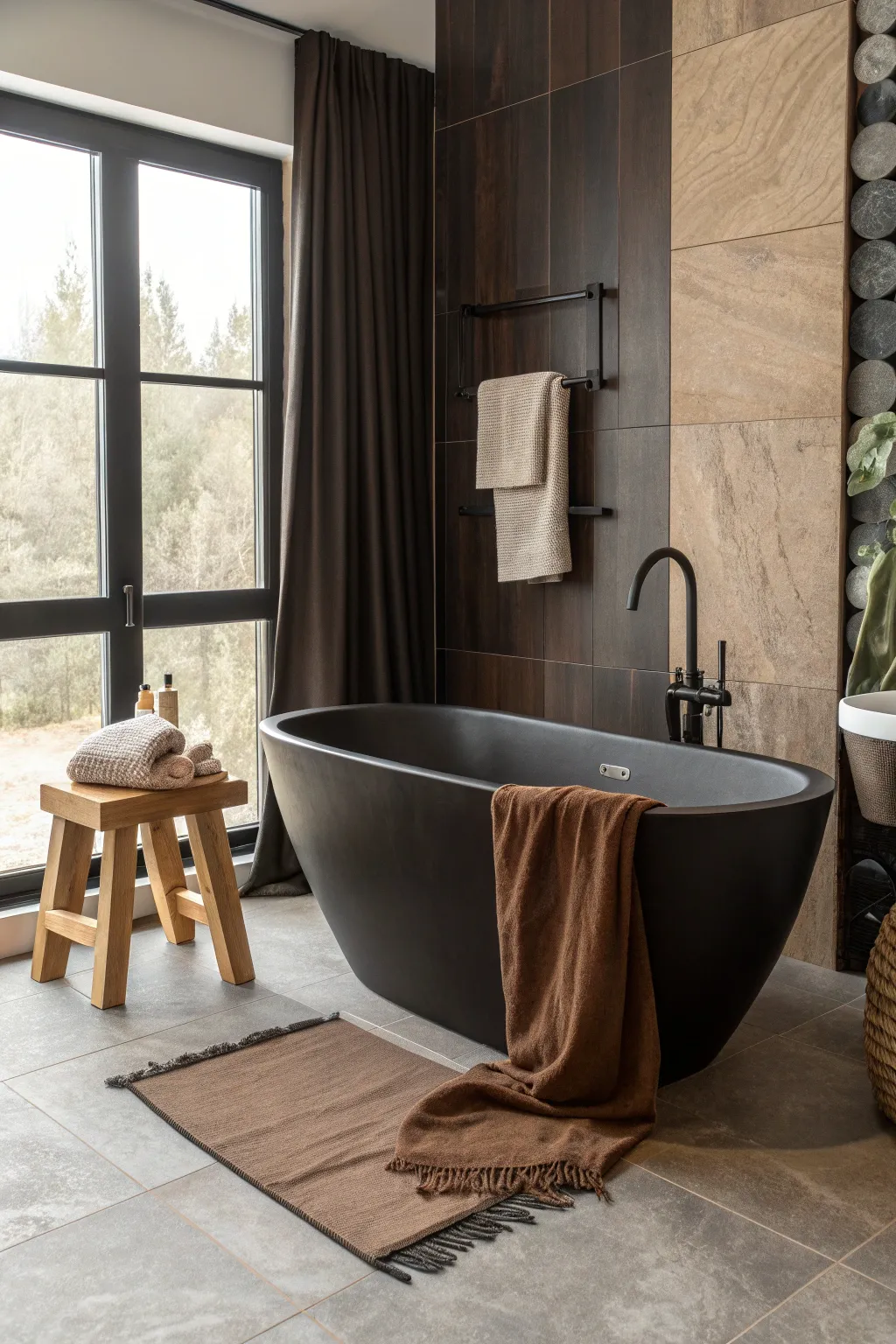 Create harmony with subtle brown hues and deep black accents. This understated approach results in a calming space, ideal for unwinding, much like a serene retreat.