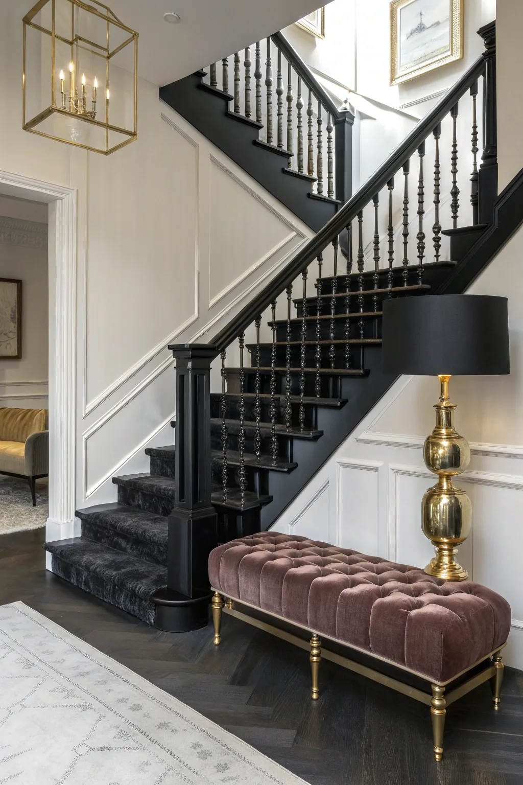 Use strategic lighting to highlight your staircase, ensuring the black elements shine without overpowering. Lighting acts like a spotlight on a stage, enhancing the drama and elegance of the design.