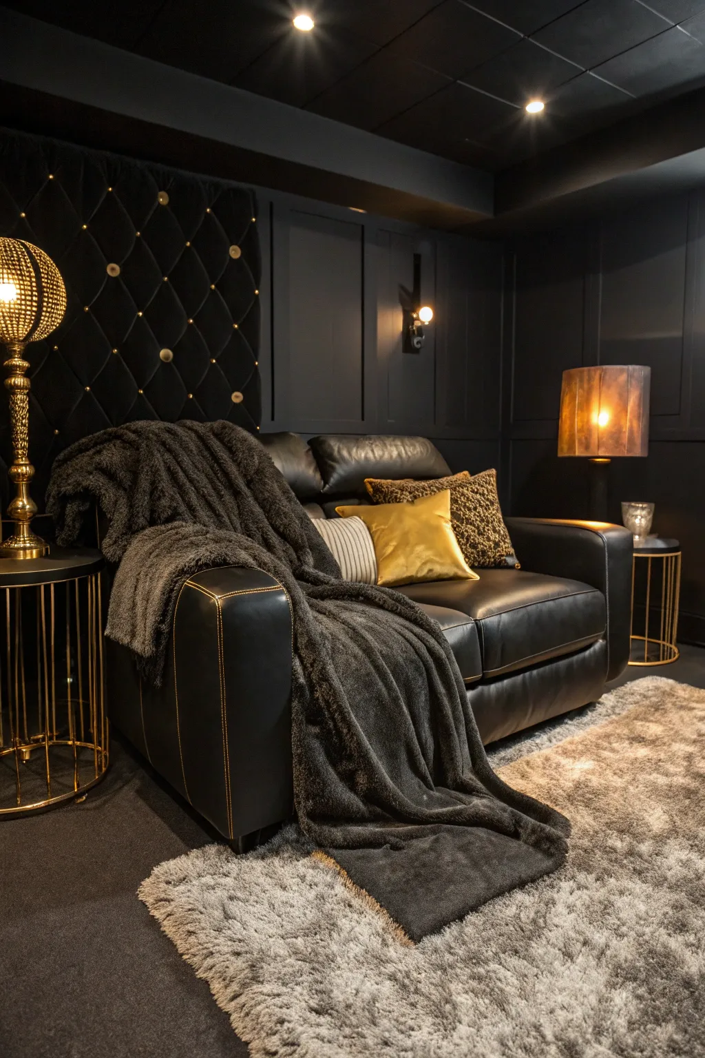 Enjoy a cinematic experience with an upscale black home theater setup.