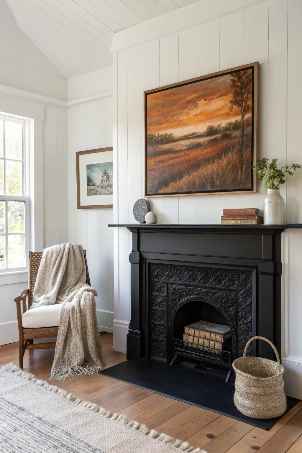 Place a striking piece of art above your black fireplace to draw the eye upward. I love how a bold painting brings character and ties the whole room together.