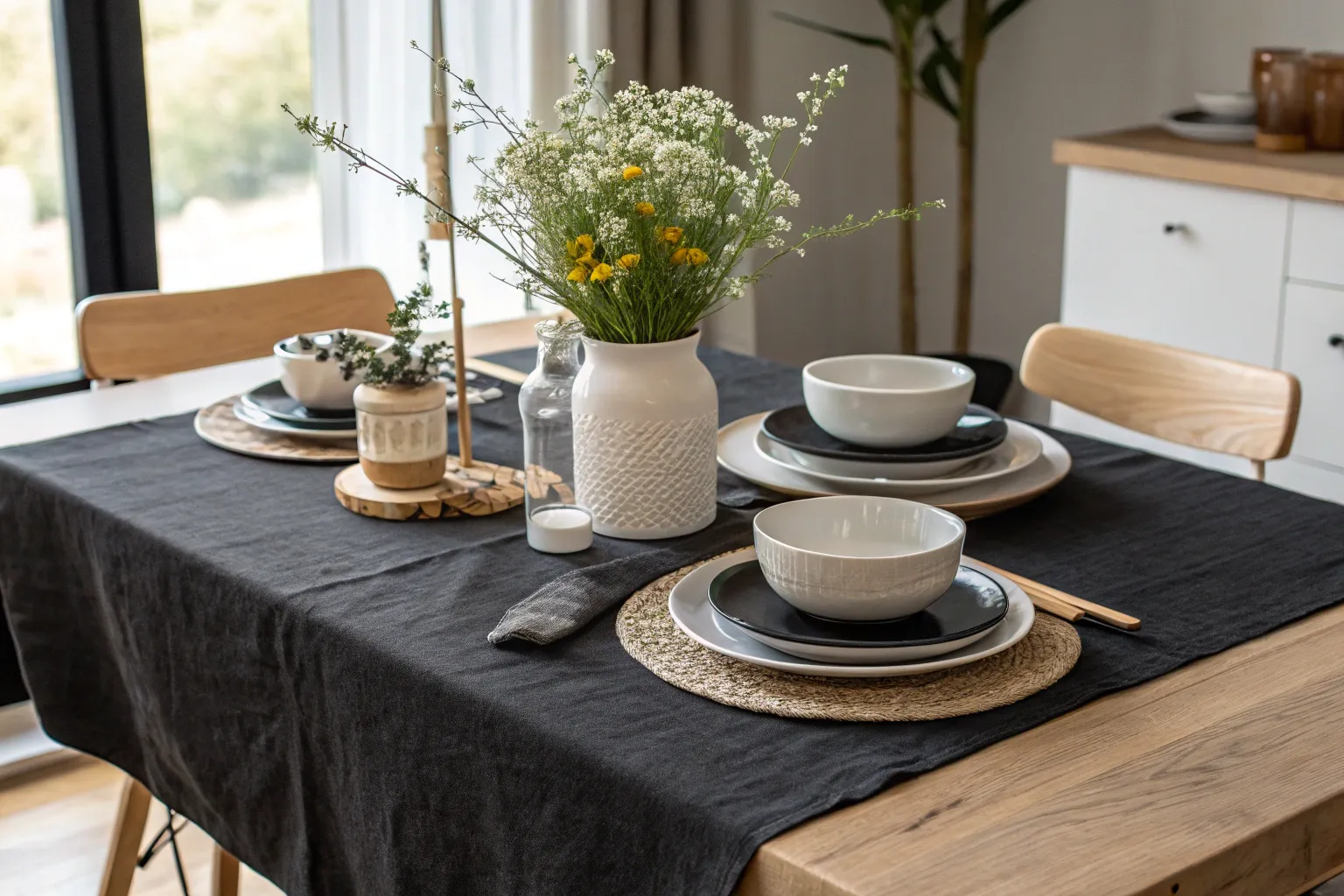 - Black Linen Table Runner: Accent your table with a classic black linen runner to enhance floral and candle arrangements.