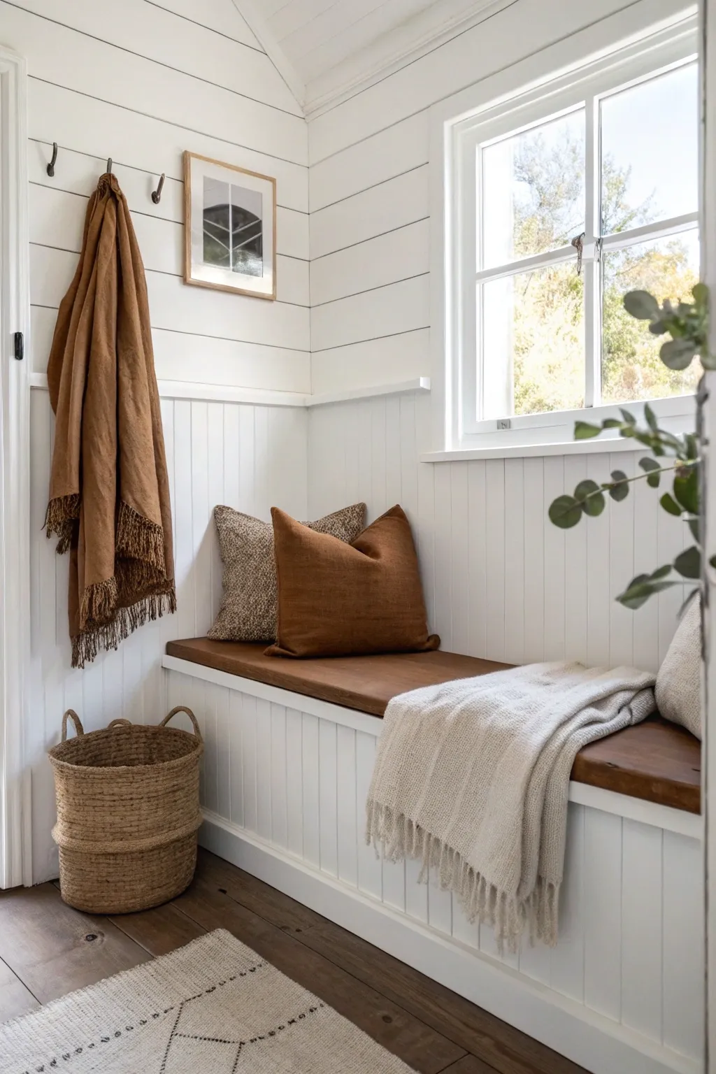 Design a cozy nook with a small bench or seating area. Use brown cushions or throws against a white backdrop to create a relaxing corner. 🛋️ #CozyBathroom #DecorInspo