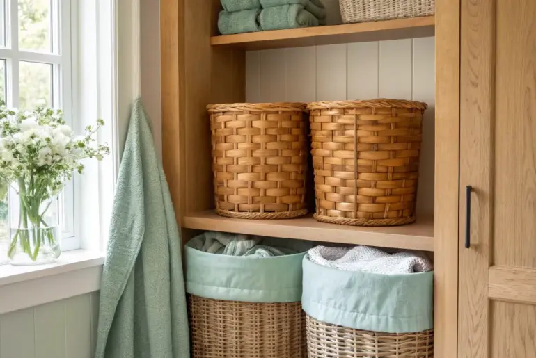 Laundry baskets don’t have to be an eyesore in your beautifully designed home. With the right storage ideas, they can blend seamlessly into your decor while keeping things tidy and organized. Overhead Shelf Storage Maximize vertical storage with overhead shelves to keep your space clutter-free. Install overhead shelves to keep baskets off the floor and within reach. This approach adds vertical storage without cluttering the space. Maybe worth checking out: Wooden Floating Shelves: Enhance your…