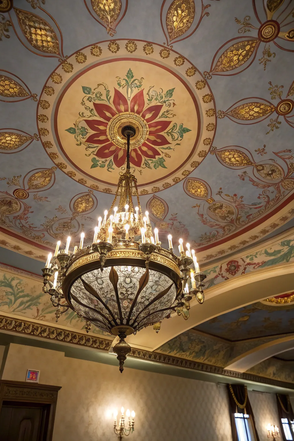 Combine art and light by integrating fixtures into your ceiling design. My chandelier is surrounded by painted motifs, making it a true centerpiece.