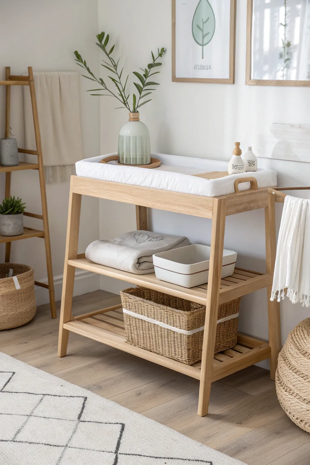 - Wooden Changing Table: Enhance your nursery with a sleek wooden changing table for a minimalist touch today.