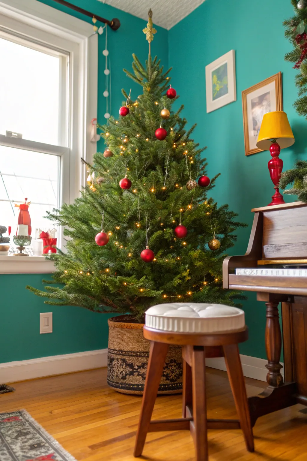 Repurpose with style using a piano stool riser that adds elegance to your tree.