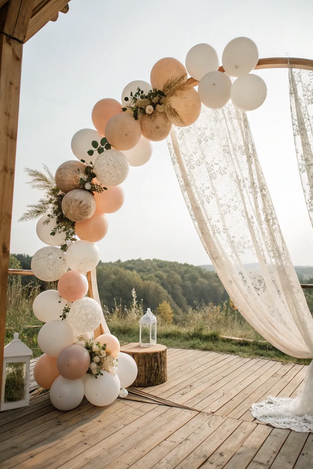 Combine neutral balloons with wooden elements for a rustic yet elegant look. This arch is perfect for barn weddings or country-themed events.