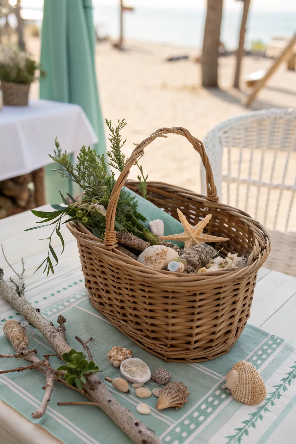 Use a wicker basket as the base for your centerpiece, filling it with driftwood, shells, and greenery. It’s a charming way to contain your coastal elements.