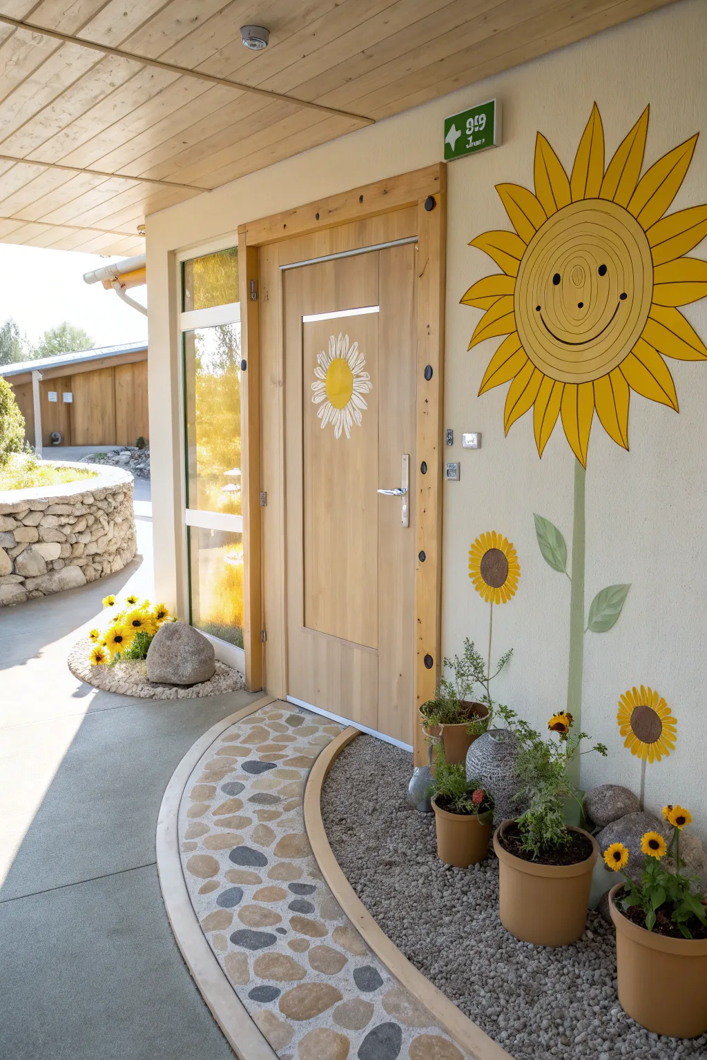 Let the sunshine in with a door decorated with smiling sunflowers and a big, bright sun. It’s a cheerful way to start the day on a sunny note.