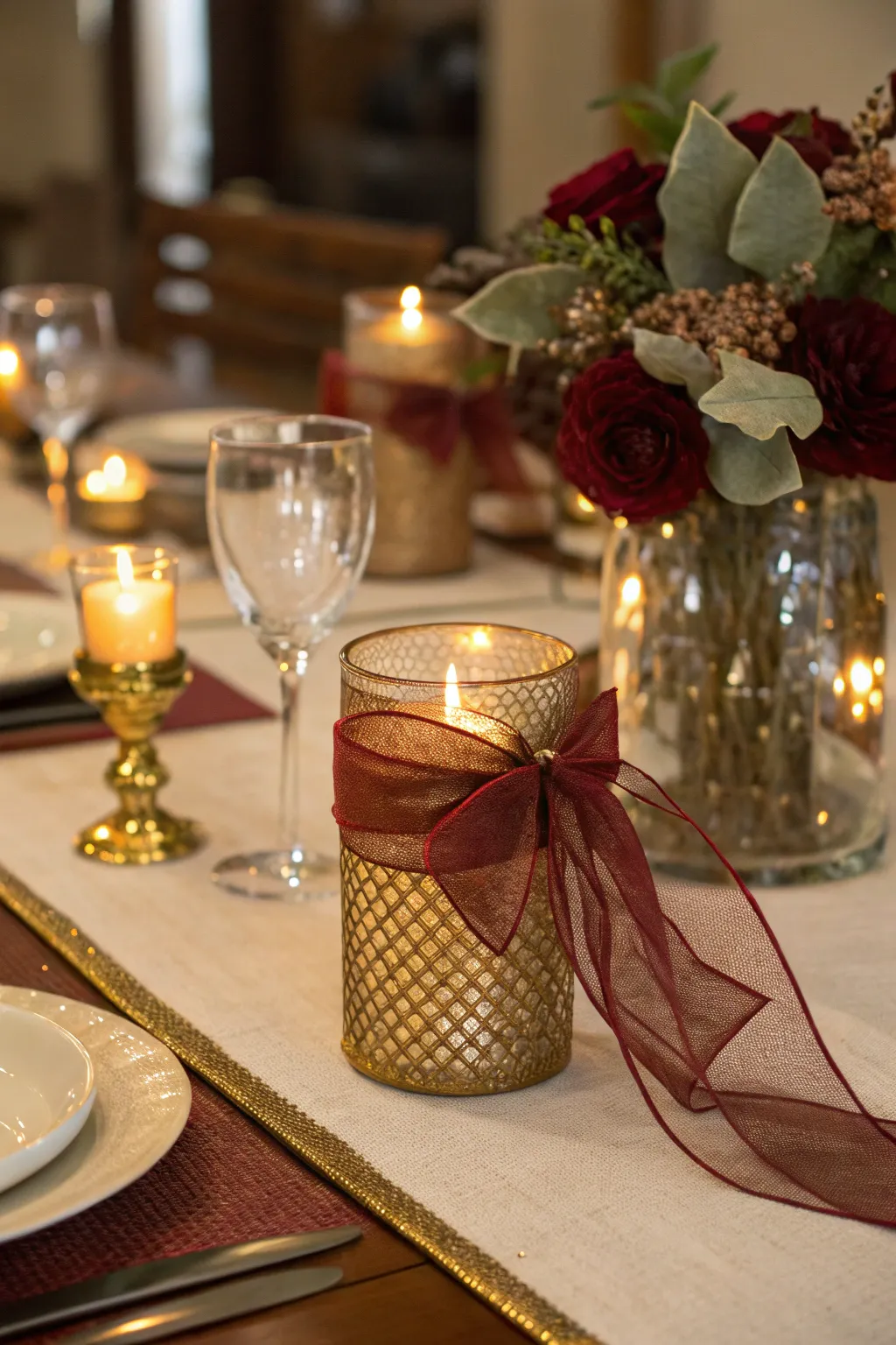 Add texture and color to your table with a mesh ribbon centerpiece. I like to wrap it around vases and candle holders for a stylish touch that catches the eye.