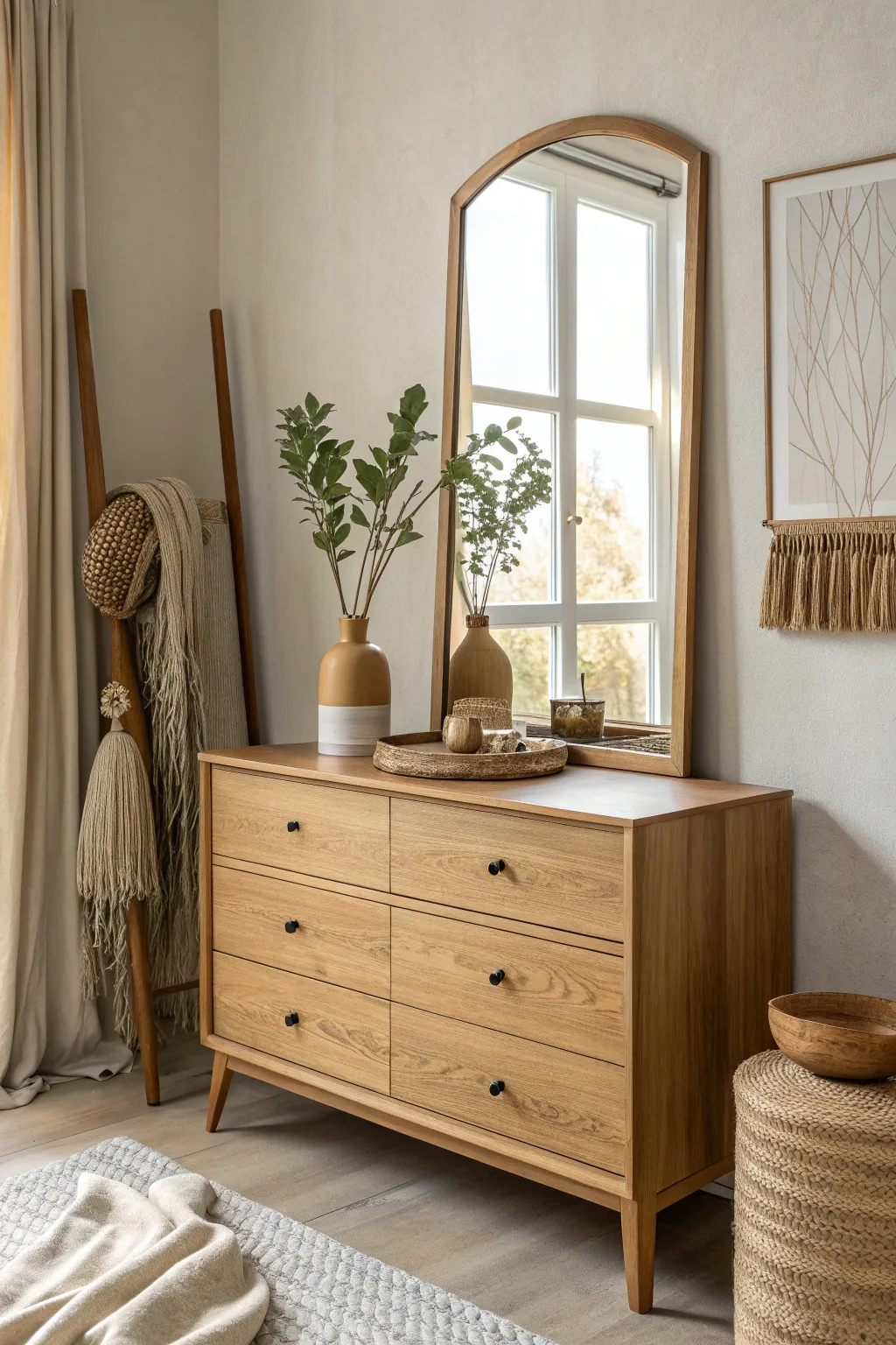 - Textured Wood Mirror Frame: Introduce rich texture with a textured wood mirror frame to complete your dresser look.