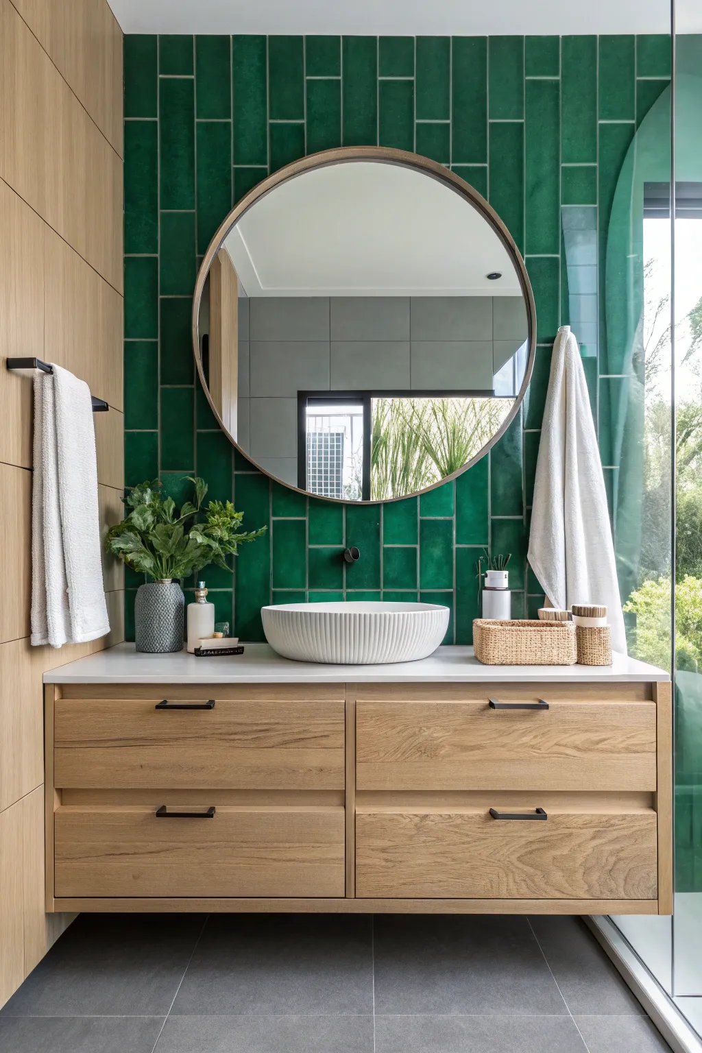 Combine emerald tiles with wooden elements for a warm, inviting atmosphere. This blend of textures feels both rustic and refined.