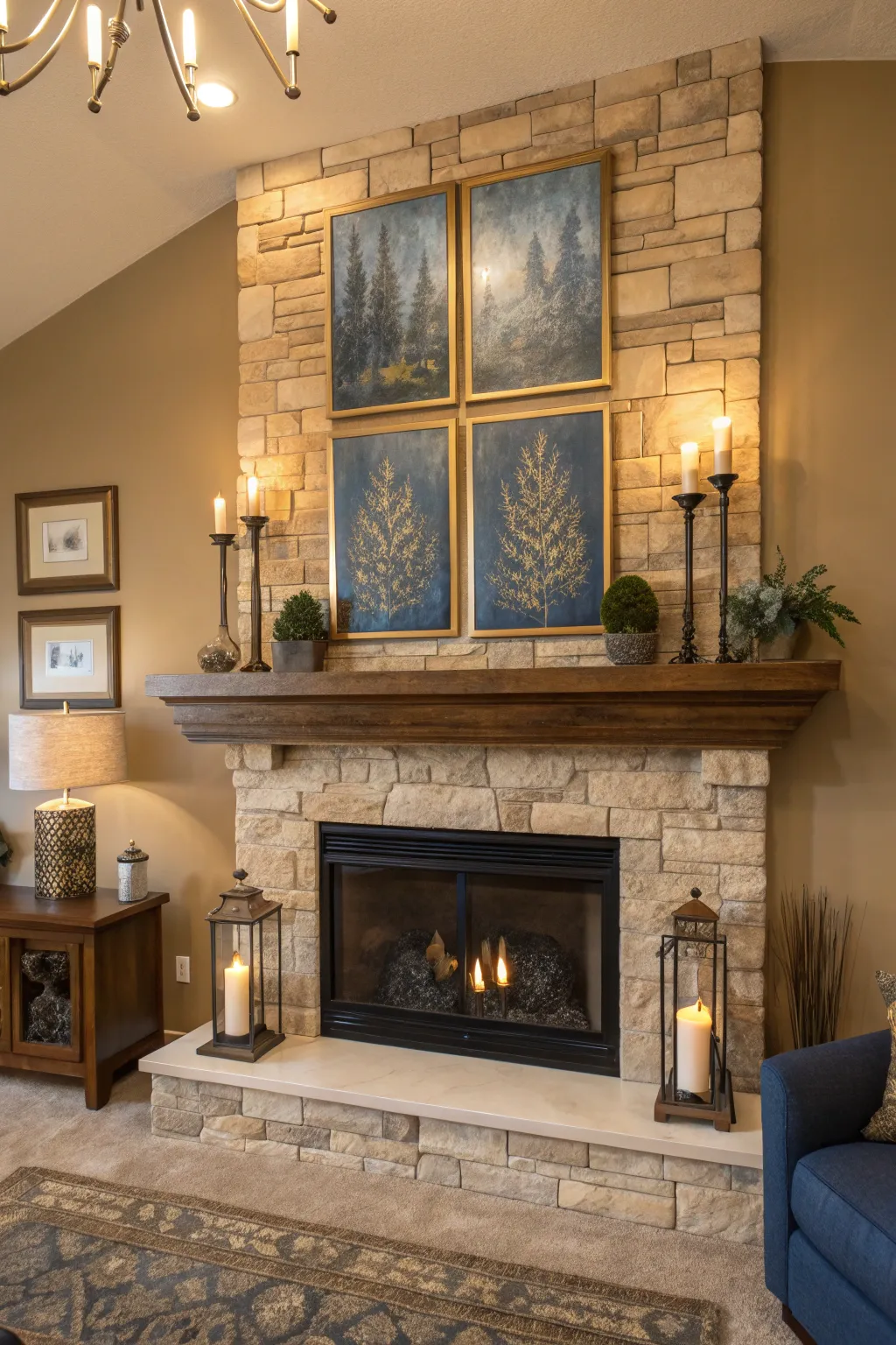 Turn your faux stone fireplace into an artistic masterpiece. Use it as a backdrop for bold artwork or a gallery wall to create an eye-catching feature.