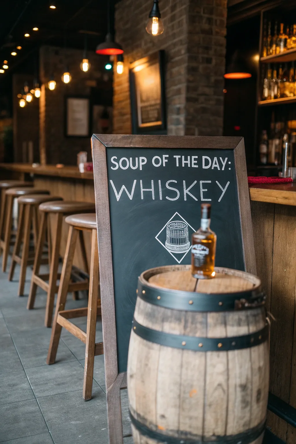 Add a twist to the menu with ‘Soup of the day: whiskey,’ a cheeky nod to your favorite spirit.