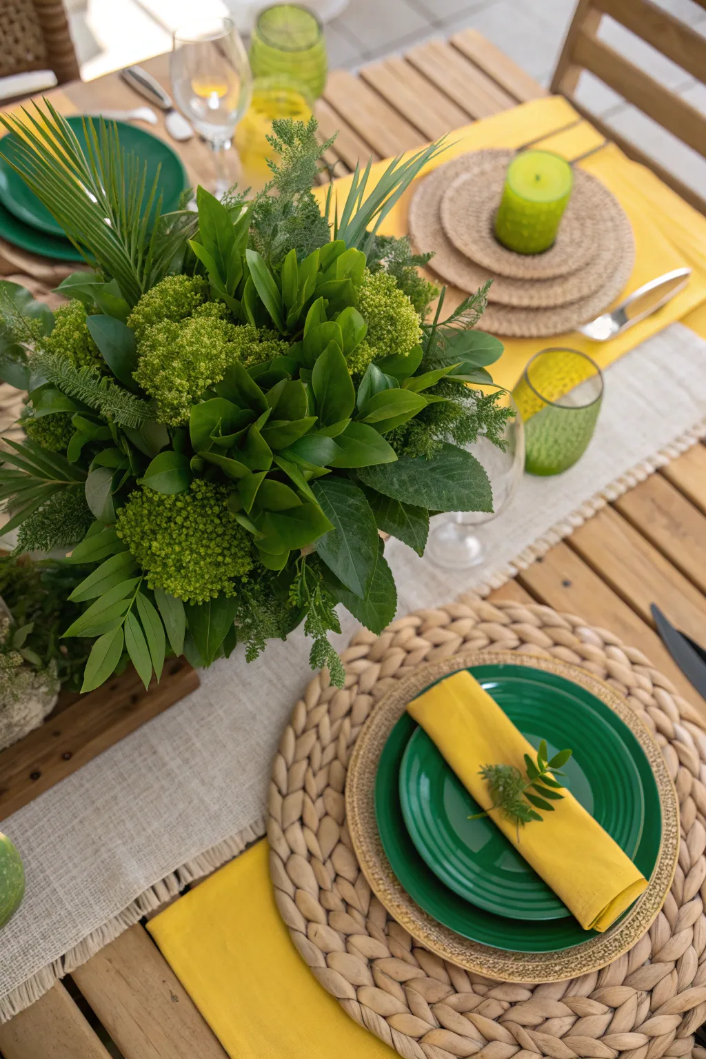 Incorporate natural textures like woven placemats or wooden elements for a rustic touch. I love how these materials add warmth and depth to a green-themed table.