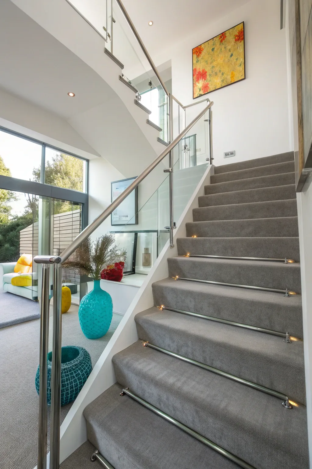 - Bright Wall Art: Incorporate bright wall art to create an eye-catching contrast with your grey stair carpet.