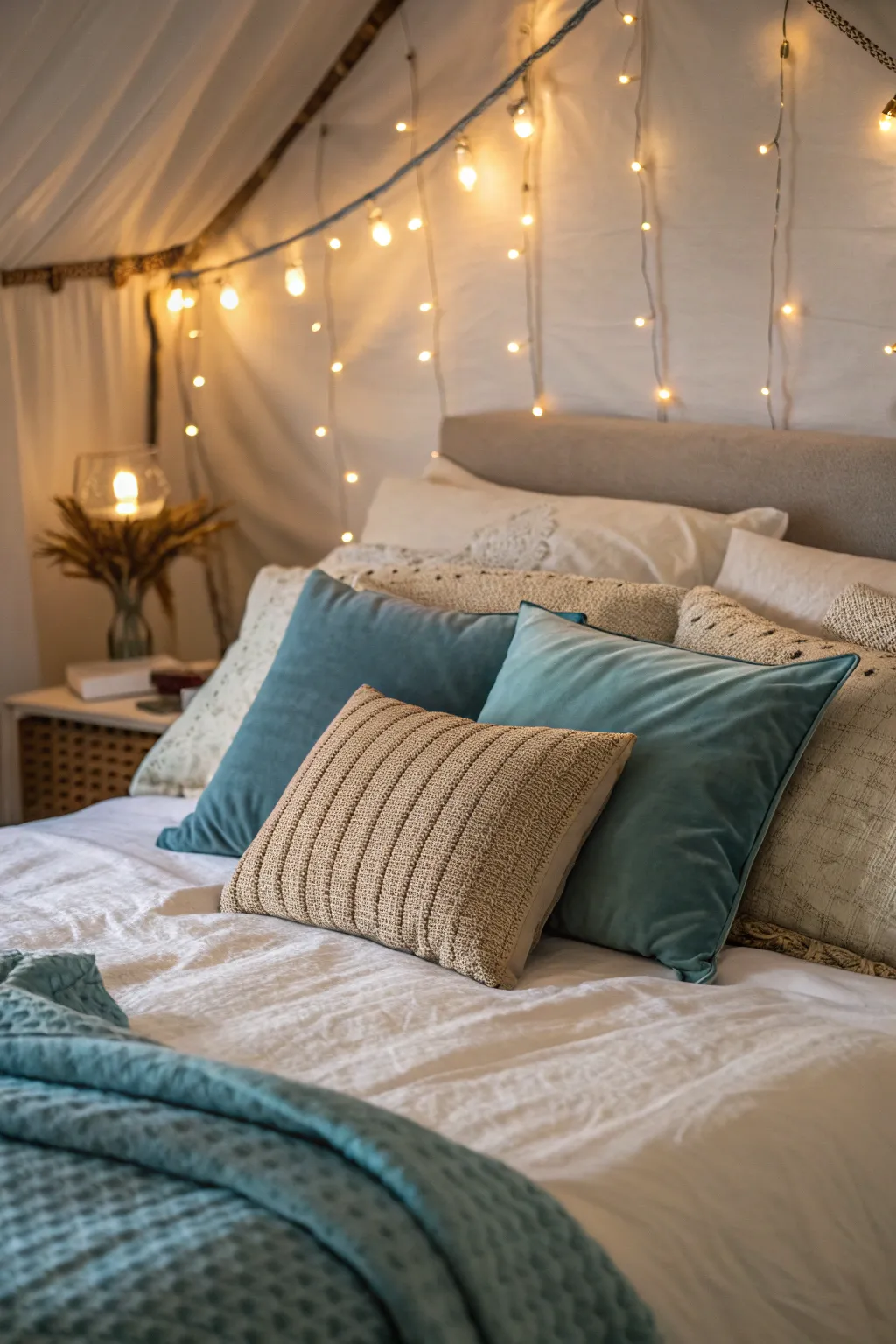 Fairy lights create a magical and serene atmosphere, perfect for a dreamy bedroom retreat.