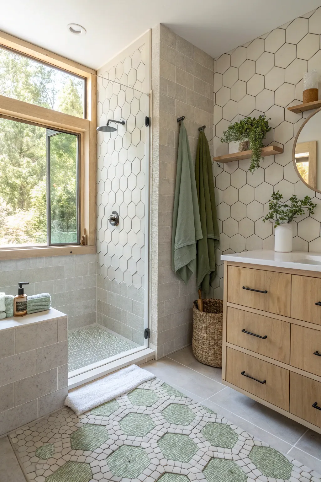 Experiment with different sizes of hexagon tiles to create dynamic patterns. This playful approach adds movement and interest to your shower.
