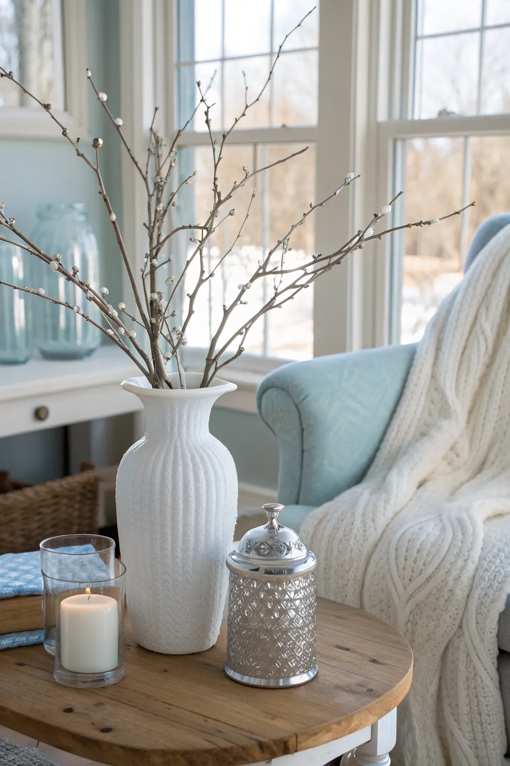 Frosted branches or faux snow can add a magical touch to your winter decor. I often use them in vases for a wintry display.
