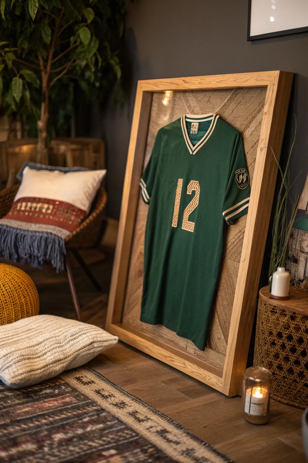 Mount your jersey on a floating shelf for a modern and airy look. This setup is perfect for a casual and flexible display that can easily adapt to your decor changes.
