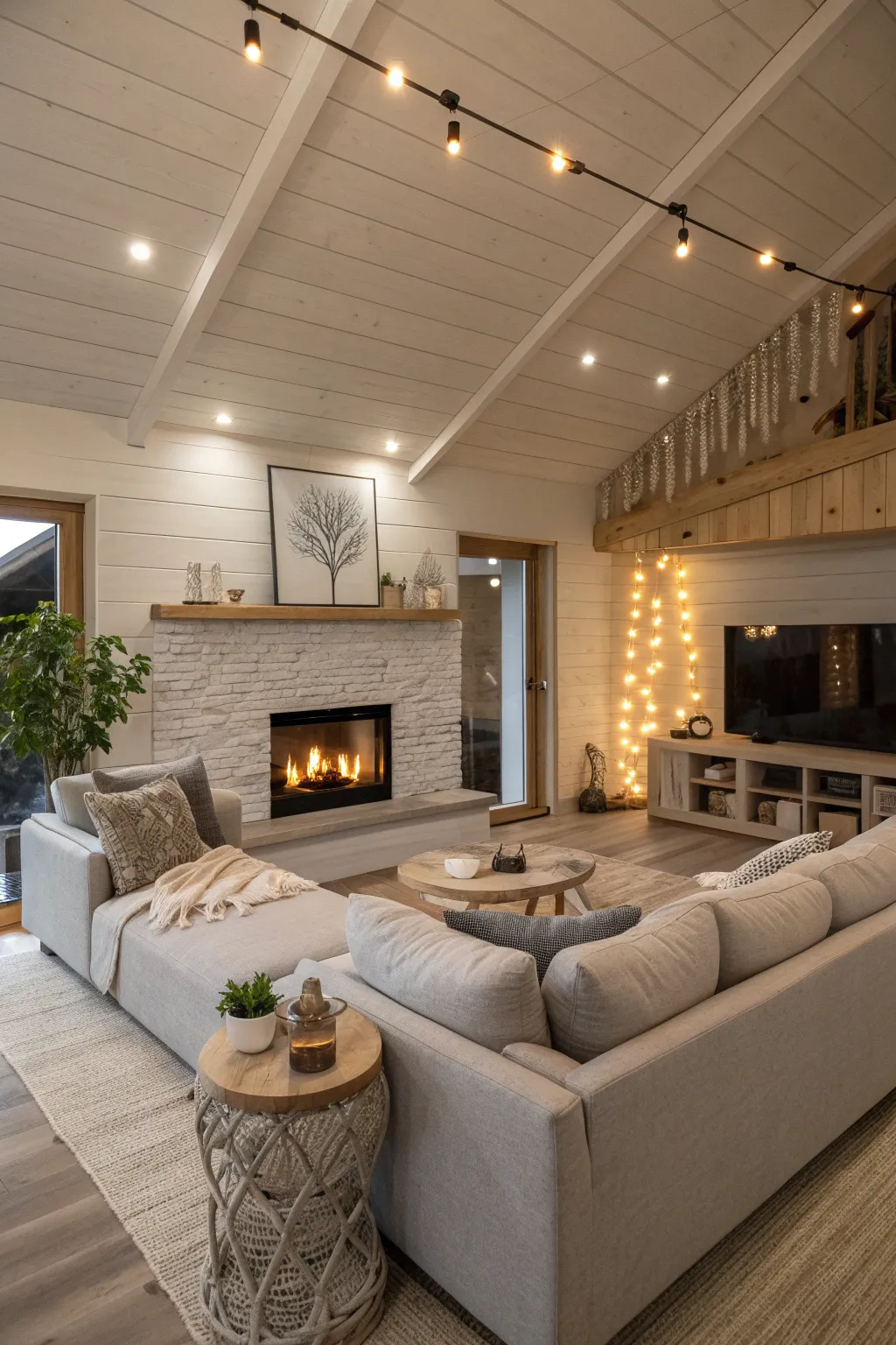 Pair a rustic stone fireplace with a plush sectional to bring the outdoors in. This combo, inspired by mountain retreats, creates a warm and inviting atmosphere perfect for family gatherings.