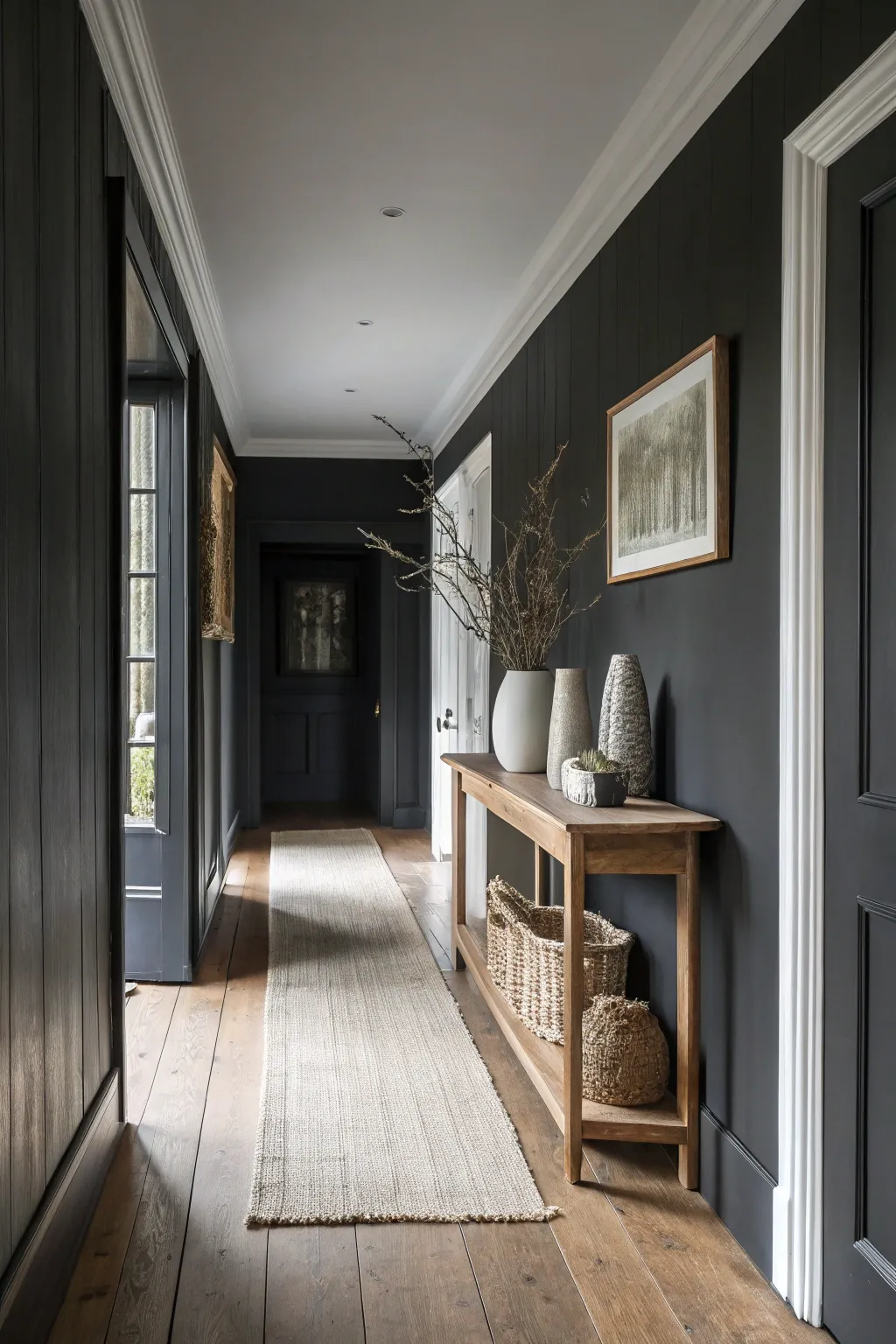 Embrace the darkness by painting your hallway in a rich, deep color. This bold choice can create a cozy, enveloping atmosphere, especially when paired with lighter accents.