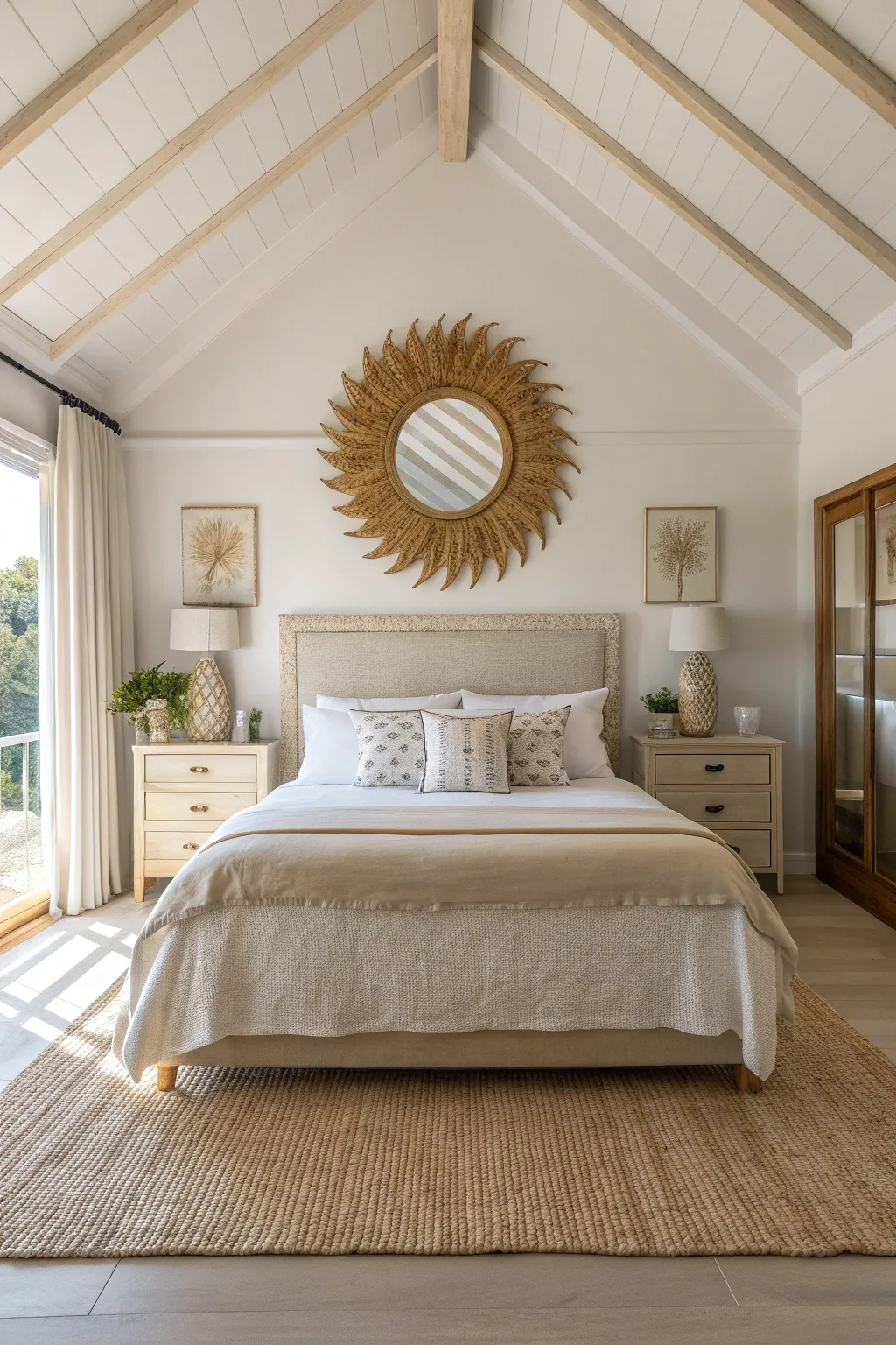 Hanging a decorative mirror above the bed can make the room feel larger and brighter. I often use mirrors to reflect light and add depth.