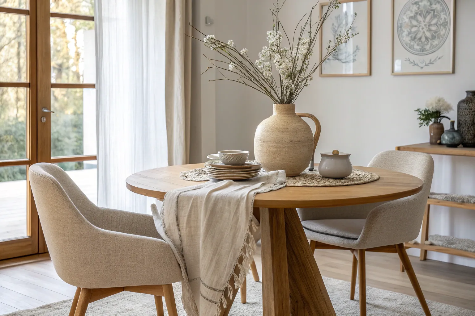 - Round Wooden Dining Table: Introduce elegance with a neutral round wooden table, elevating your dining space effortlessly.