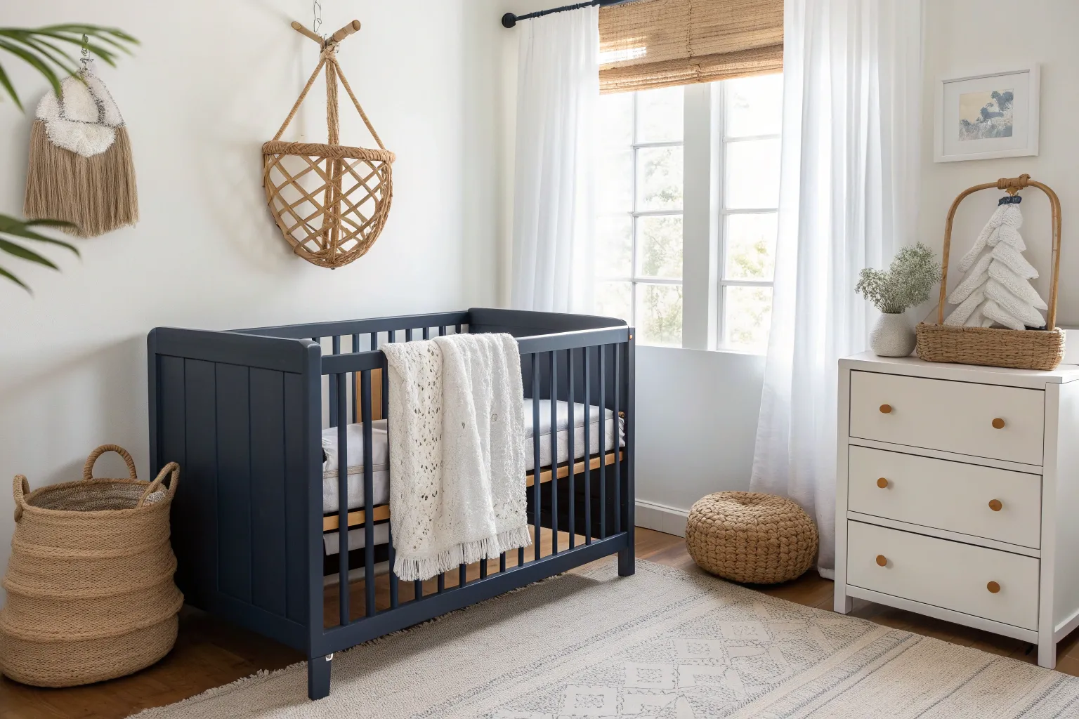 - Navy and White Nursery Rug: Add texture and warmth with a stylish navy and white nursery rug.