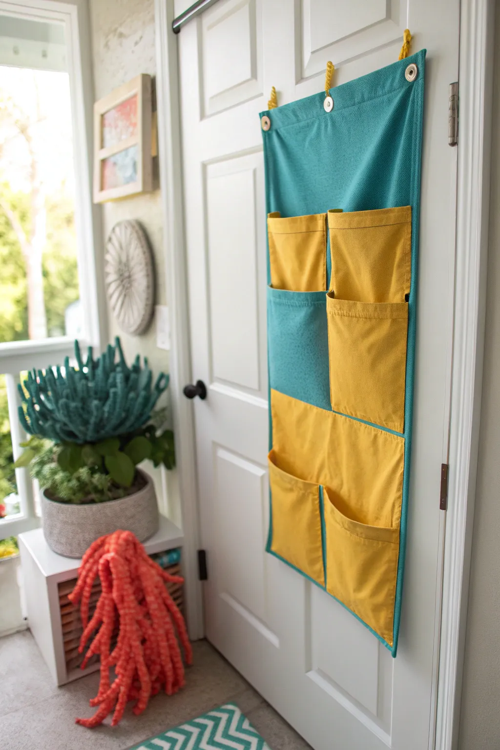 Add fabric pockets for a soft and flexible storage option on your pantry door. These pockets are perfect for lightweight items and a touch of coziness.