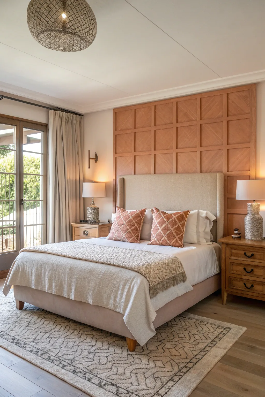 A statement headboard defines the room’s character and style.