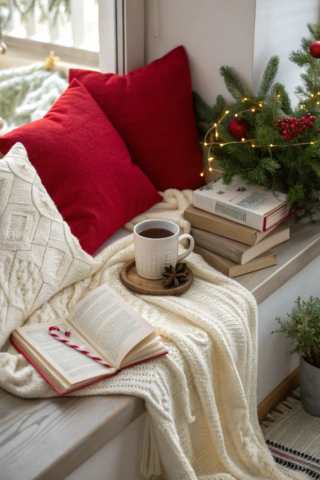 Create a cozy nook with red pillows and a white knit blanket. It’s perfect for curling up with a good book during the holidays.