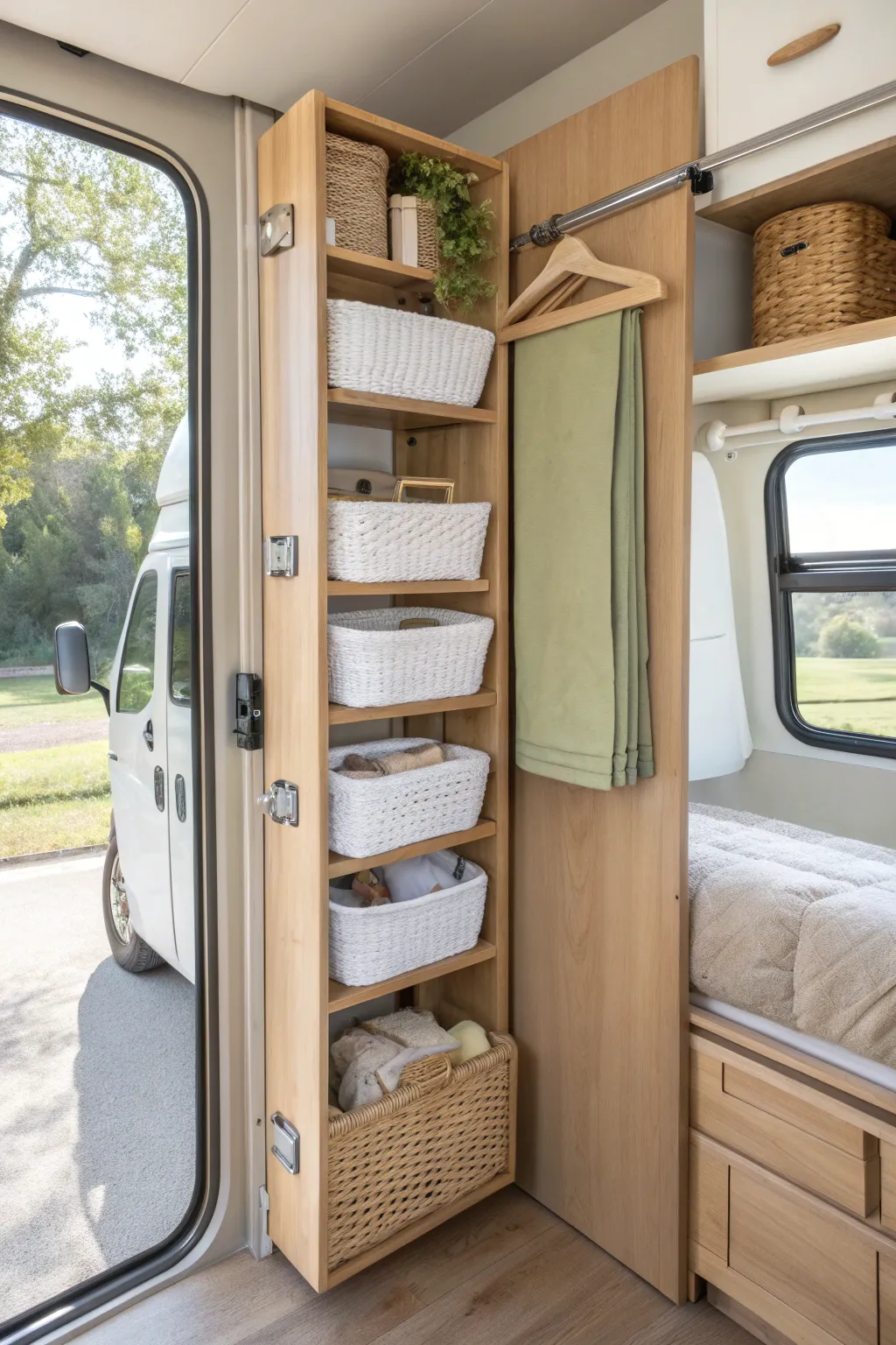 • Adjustable Closet Shelving Units: Transform your RV closet with adjustable shelving for a flexible and organized space today.