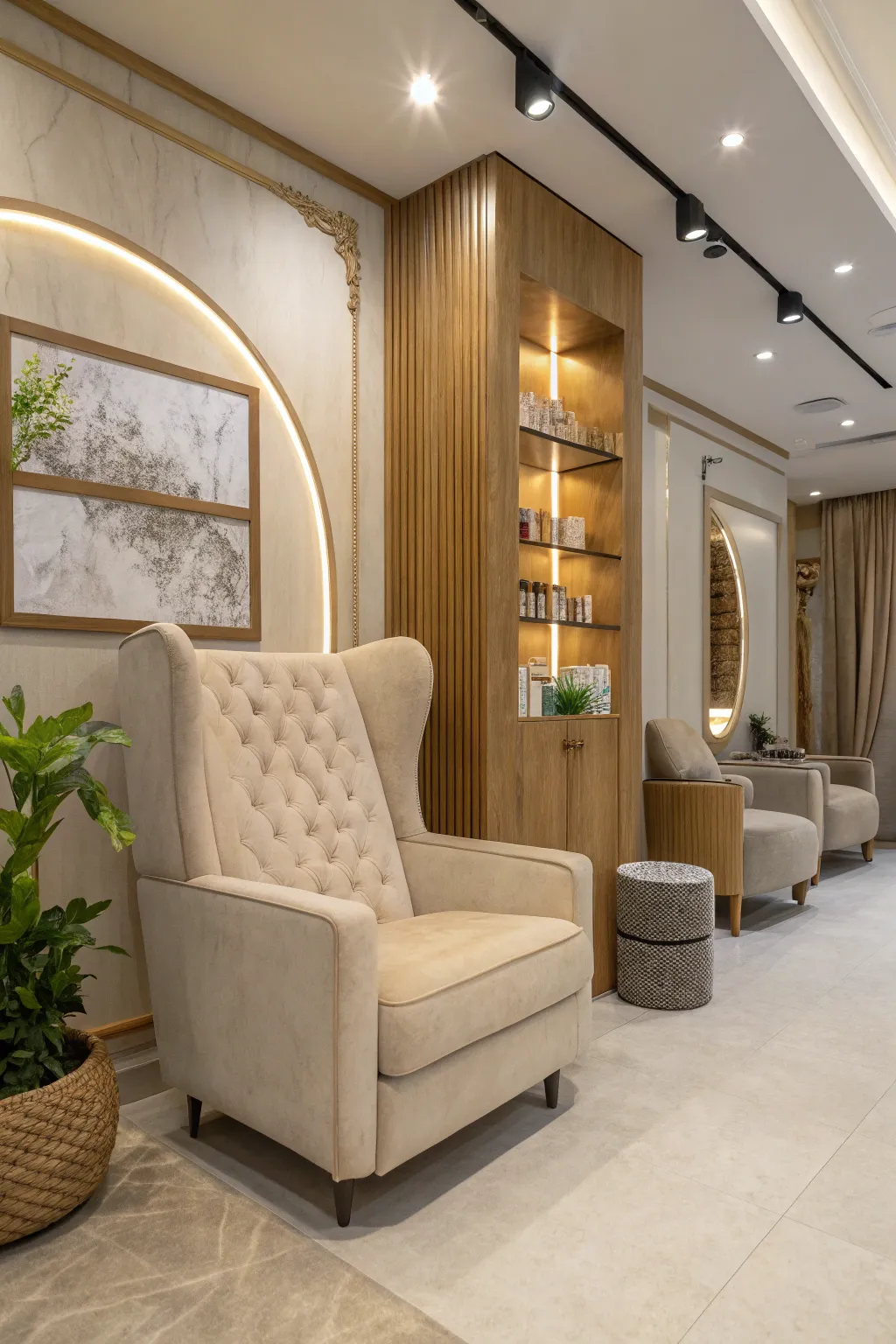 - Plush Wingback Accent Chair: Enhance comfort and elegance with this plush chair, perfect for a luxurious salon ambiance.