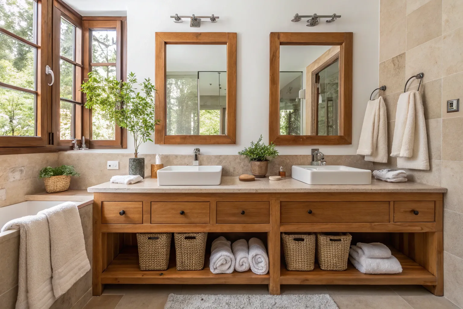 • Natural Wood Bathroom Vanity: Enhance bathroom charm with a natural wood vanity for a timeless, neutral aesthetic.