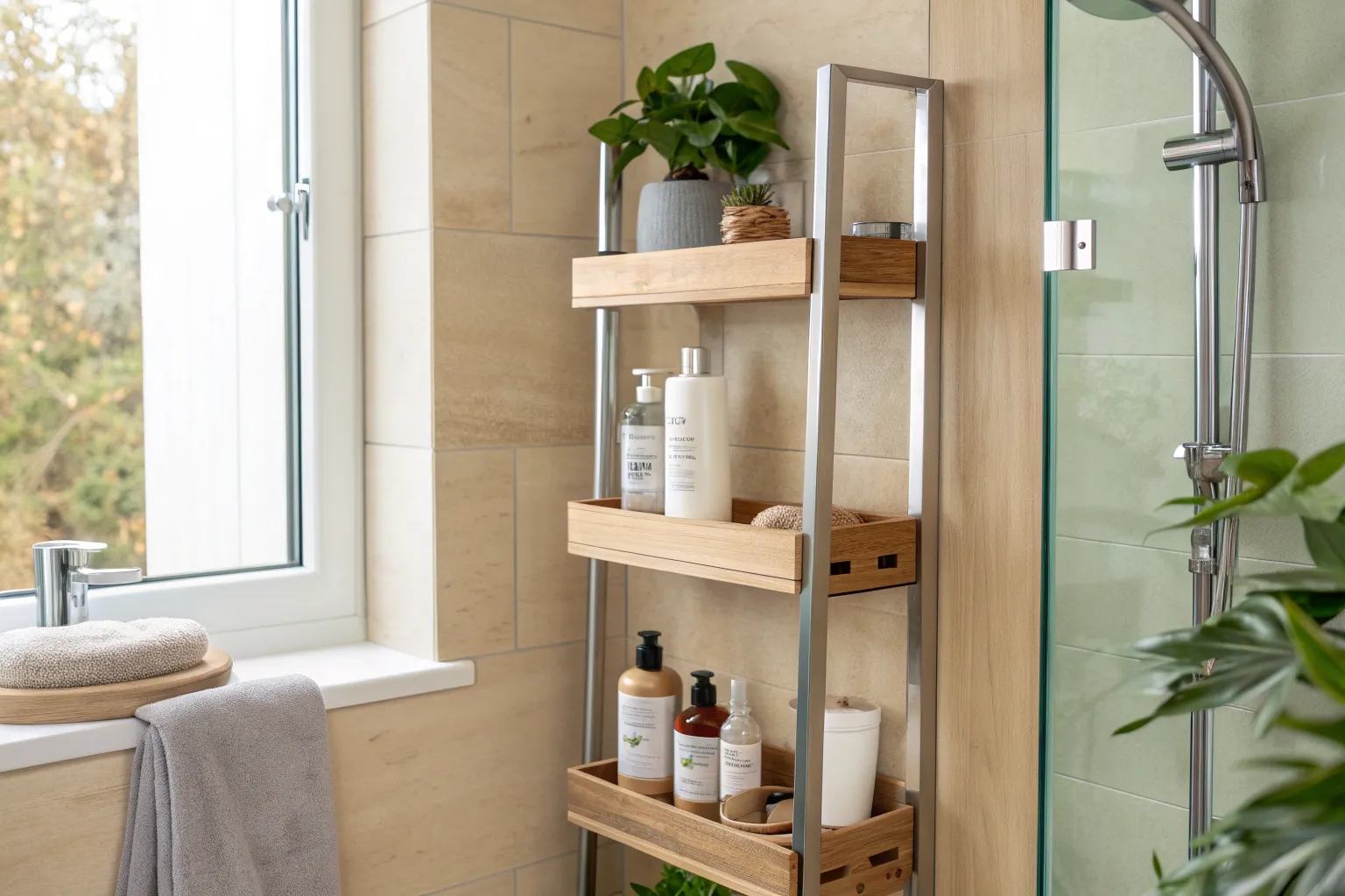 One of my favorite tricks is using tiered shelving in the shower’s corner. It makes use of vertical space, allowing you to store plenty of bottles and essentials without cluttering your shower floor.