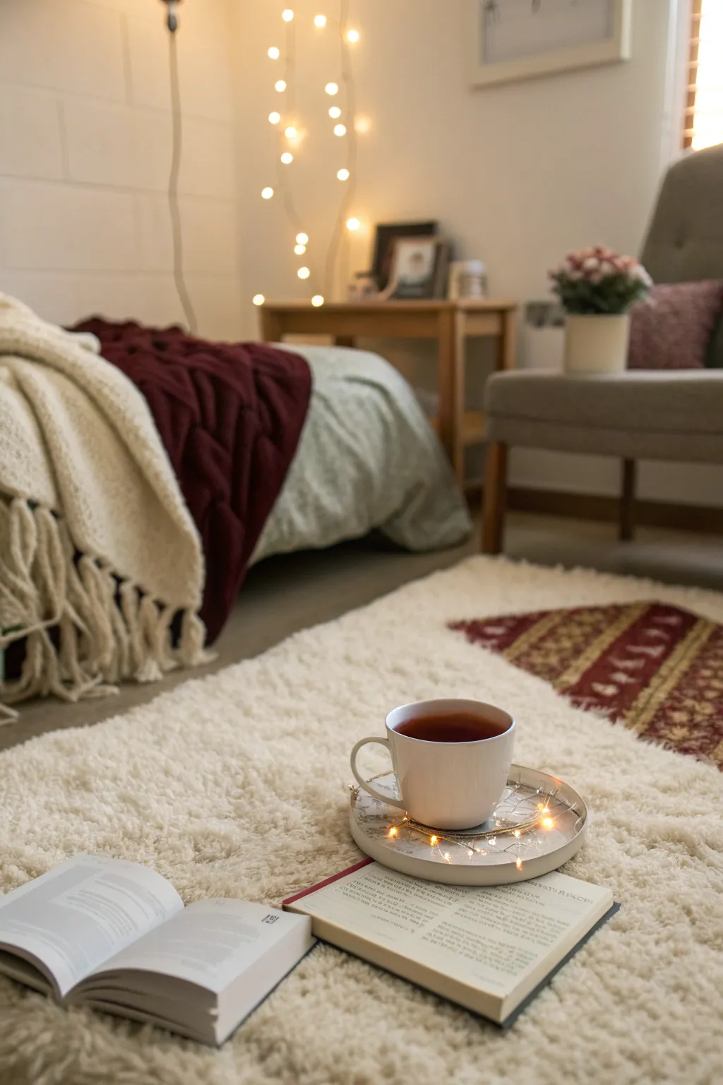 A plush rug can add warmth and define different areas of your room. During cold Denver winters, a cozy rug was my favorite spot to unwind with a cup of tea.