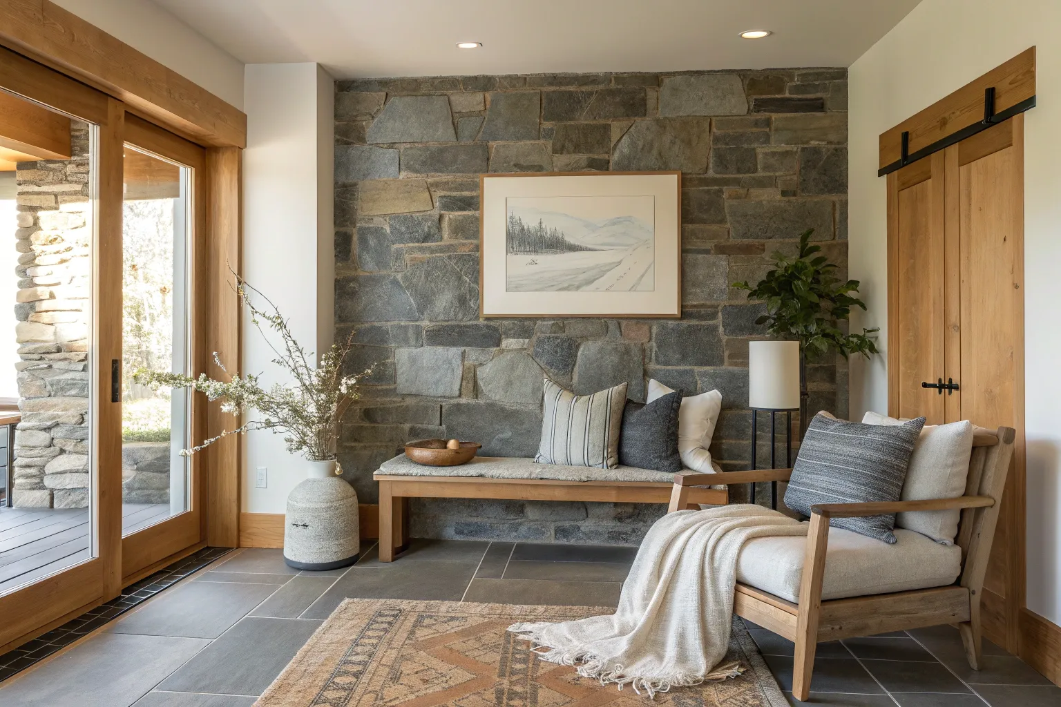 Pair a slate wall with rustic decor for a charming and cozy vibe. This combination brings a touch of countryside allure into any space. 🌿 #RusticDecor #CozyLiving
