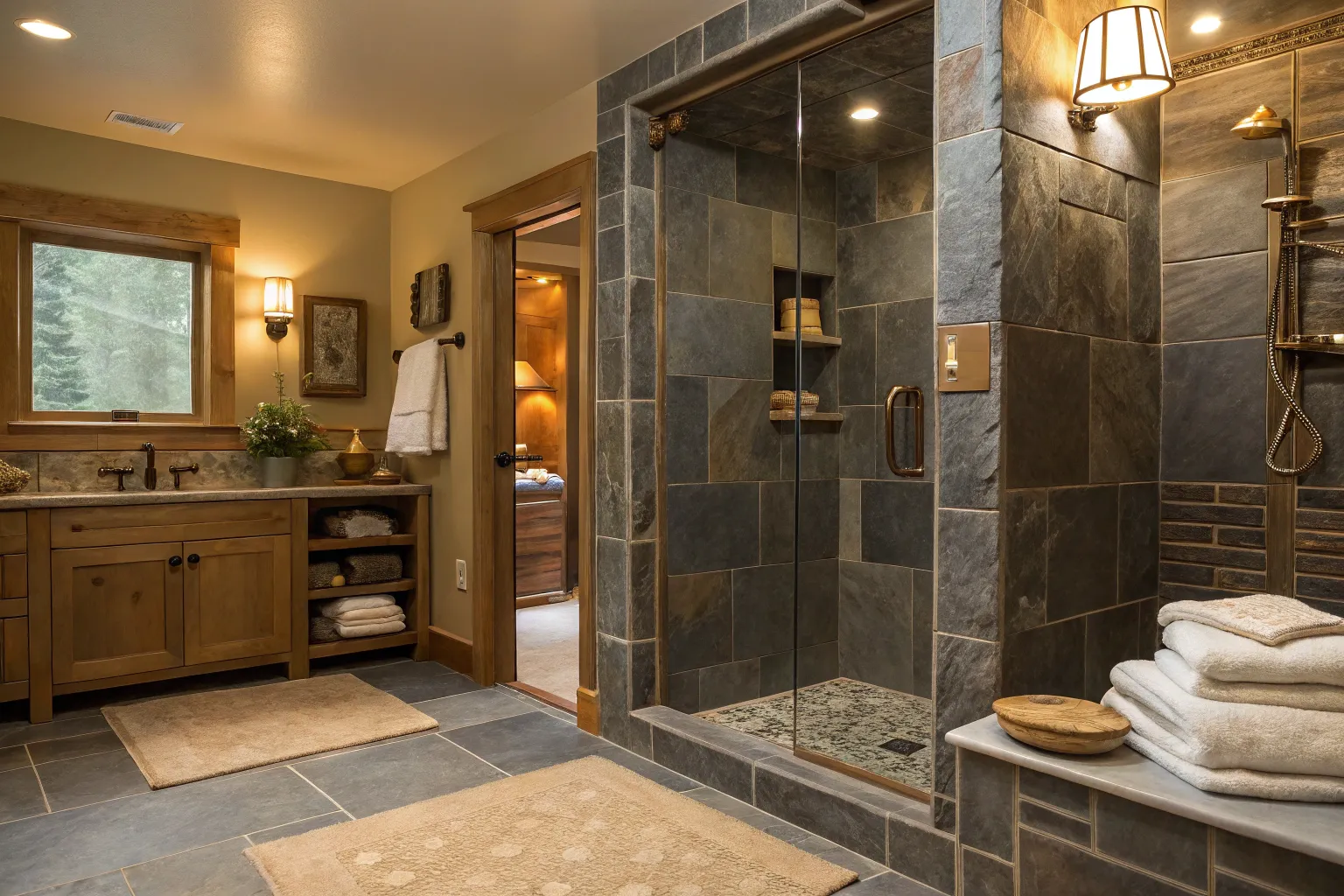 Large slate tiles create a sleek, modern look with fewer grout lines, giving your bathroom a spacious feel. I’ve found that these can make even small bathrooms appear expansive and elegant.