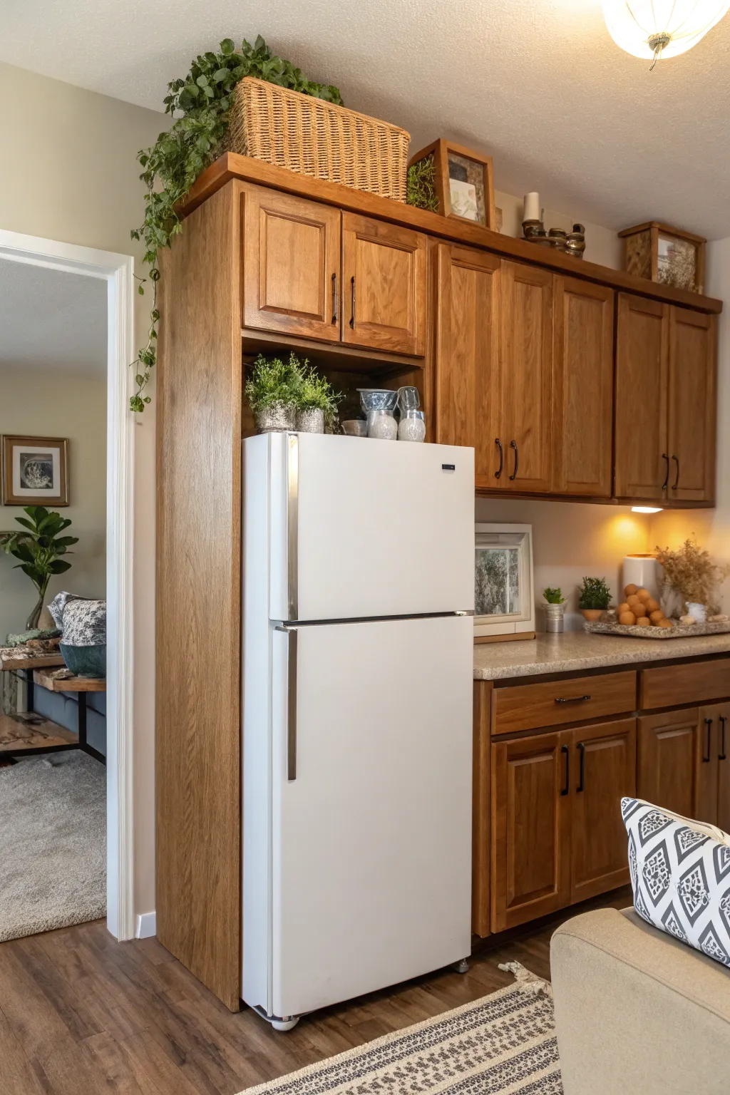 Maximize vertical space by hanging cabinets above the fridge. This strategy has helped me create additional storage without sacrificing floor space.