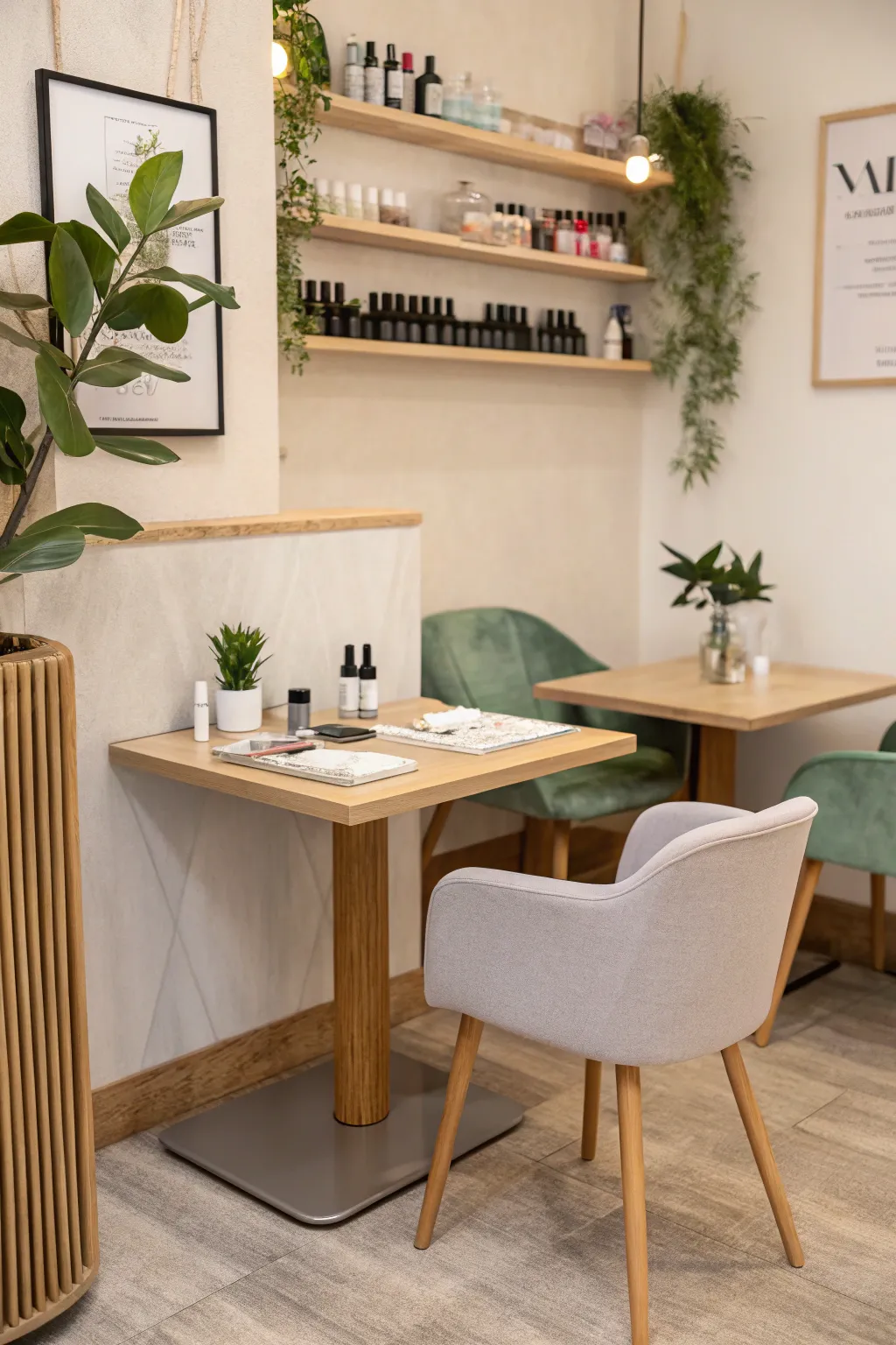 Natural wood elements add warmth and an inviting feel to your salon. A wooden reception desk or shelves can bring a touch of nature indoors.