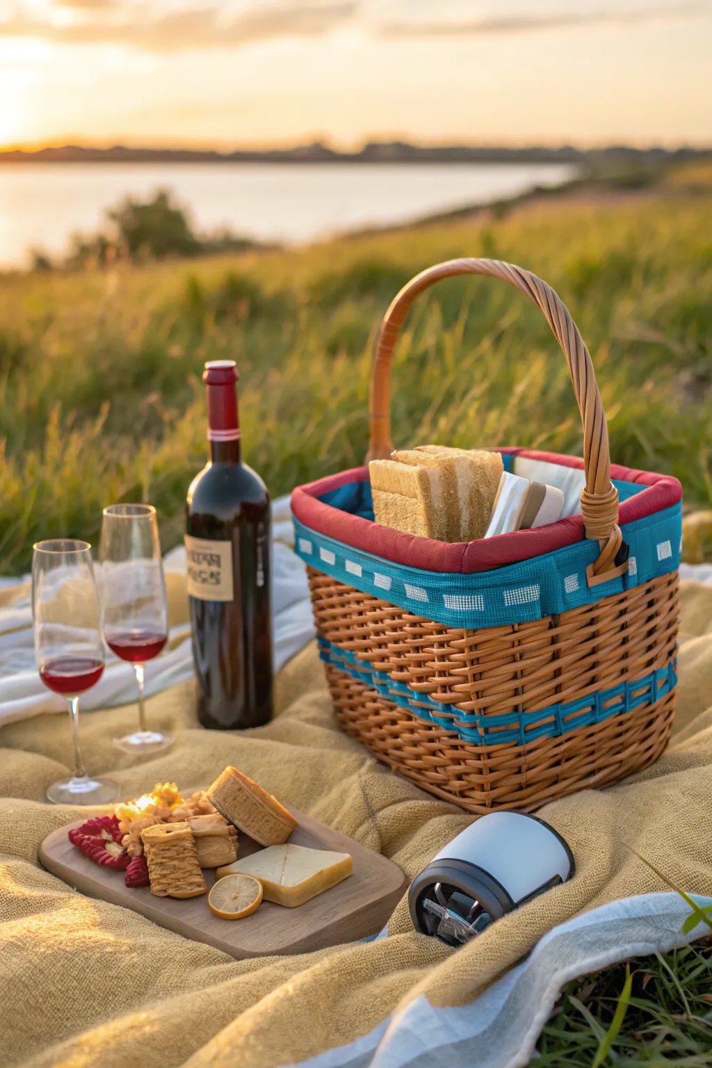 Pack a basket with cheese, crackers, and a bottle of wine for an evening picnic. A small portable speaker adds the perfect touch for music under the stars.